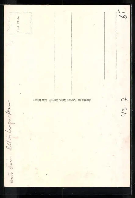 Personenbezogene Daten auf der Rückseite der Karte wurden durch blauen Textmarker unkenntlich gemacht. Die blauen Stellen sind auf die Vorderseite durchgeweicht und wirken sich negativ auf das Postkartenfoto aus