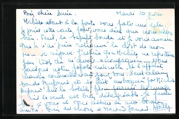 Personenbezogene Daten auf der Rückseite der Karte wurden durch blauen Textmarker unkenntlich gemacht. Die blauen Stellen sind auf die Vorderseite durchgeweicht und wirken sich negativ auf das Postkartenfoto aus