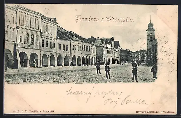 AK Litomysl, Strassenpartie mit Geschäften und Passanten