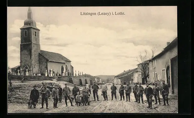 AK Litzingen i. Lothr., Strassenpartie mit Kirche und Soldaten
