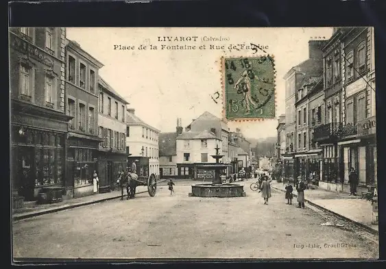 AK Livarot, Place de la Fontaine et Rue de Falaise