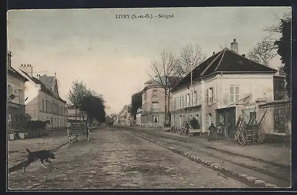 AK Livry, Vue de la rue principale avec bâtiments et chariots