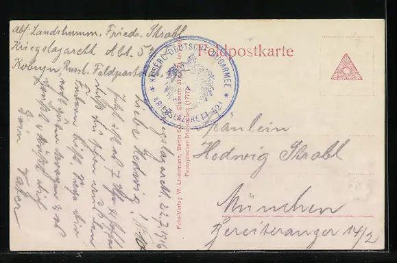 Personenbezogene Daten auf der Rückseite der Karte wurden durch blauen Textmarker unkenntlich gemacht. Die blauen Stellen sind auf die Vorderseite durchgeweicht und wirken sich negativ auf das Postkartenfoto aus