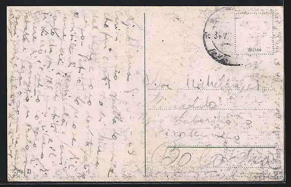Personenbezogene Daten auf der Rückseite der Karte wurden durch blauen Textmarker unkenntlich gemacht. Die blauen Stellen sind auf die Vorderseite durchgeweicht und wirken sich negativ auf das Postkartenfoto aus