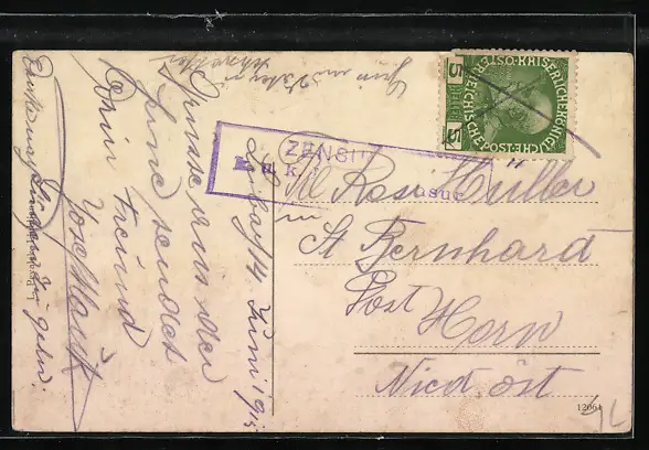 Personenbezogene Daten auf der Rückseite der Karte wurden durch blauen Textmarker unkenntlich gemacht. Die blauen Stellen sind auf die Vorderseite durchgeweicht und wirken sich negativ auf das Postkartenfoto aus