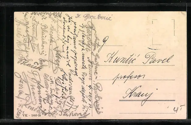 Personenbezogene Daten auf der Rückseite der Karte wurden durch blauen Textmarker unkenntlich gemacht. Die blauen Stellen sind auf die Vorderseite durchgeweicht und wirken sich negativ auf das Postkartenfoto aus