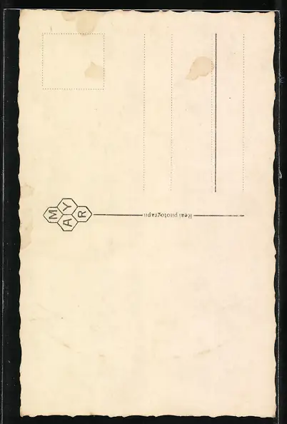 Personenbezogene Daten auf der Rückseite der Karte wurden durch blauen Textmarker unkenntlich gemacht. Die blauen Stellen sind auf die Vorderseite durchgeweicht und wirken sich negativ auf das Postkartenfoto aus