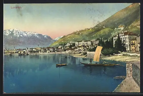 AK Locarno, Uferpartie mit Segelboot