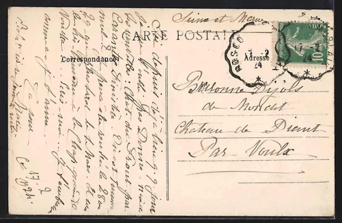 Personenbezogene Daten auf der Rückseite der Karte wurden durch blauen Textmarker unkenntlich gemacht. Die blauen Stellen sind auf die Vorderseite durchgeweicht und wirken sich negativ auf das Postkartenfoto aus