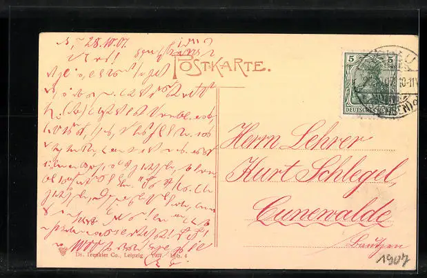 Personenbezogene Daten auf der Rückseite der Karte wurden durch blauen Textmarker unkenntlich gemacht. Die blauen Stellen sind auf die Vorderseite durchgeweicht und wirken sich negativ auf das Postkartenfoto aus