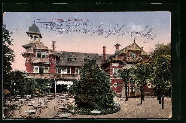 AK Löbau, Gasthaus Honigbrunnen mit Garten