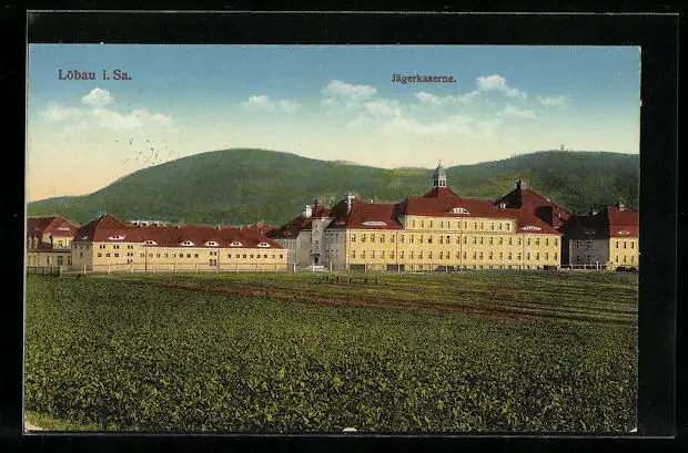 AK Löbau /Sa., Jägerkaserne mit Feldern und Bergkulisse