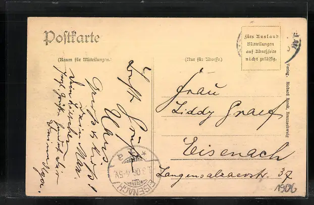 alte Ansichtskarte, gelaufen 1906, Briefmarke entfernt, guter Zustand
