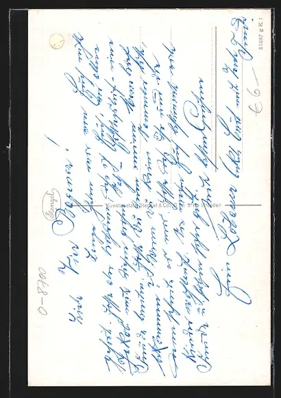 Personenbezogene Daten auf der Rückseite der Karte wurden durch blauen Textmarker unkenntlich gemacht. Die blauen Stellen sind auf die Vorderseite durchgeweicht und wirken sich negativ auf das Postkartenfoto aus