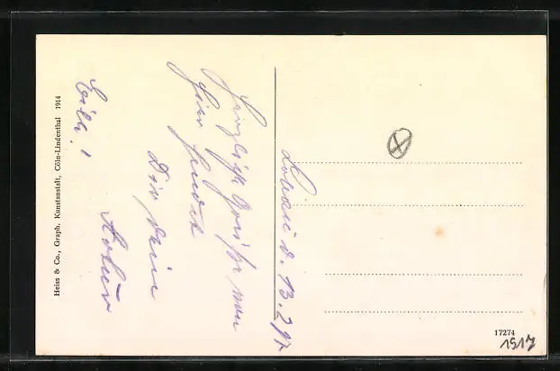 Personenbezogene Daten auf der Rückseite der Karte wurden durch blauen Textmarker unkenntlich gemacht. Die blauen Stellen sind auf die Vorderseite durchgeweicht und wirken sich negativ auf das Postkartenfoto aus