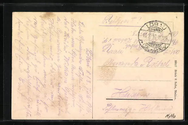 Personenbezogene Daten auf der Rückseite der Karte wurden durch blauen Textmarker unkenntlich gemacht. Die blauen Stellen sind auf die Vorderseite durchgeweicht und wirken sich negativ auf das Postkartenfoto aus