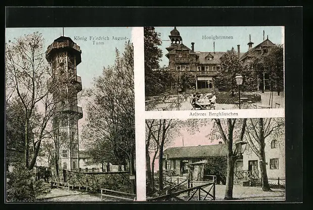 AK Löbau i. Sa., König Friedrich August-Turm mit Gasthaus Honigbrunnen