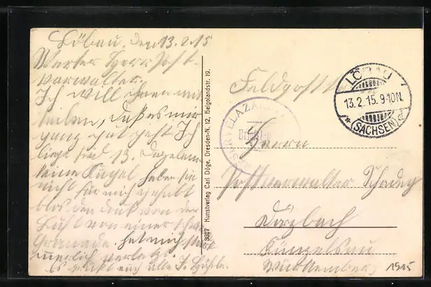 alte Ansichtskarte, gelaufen 1915 als Feldpost, Stempelspur, guter Zustand