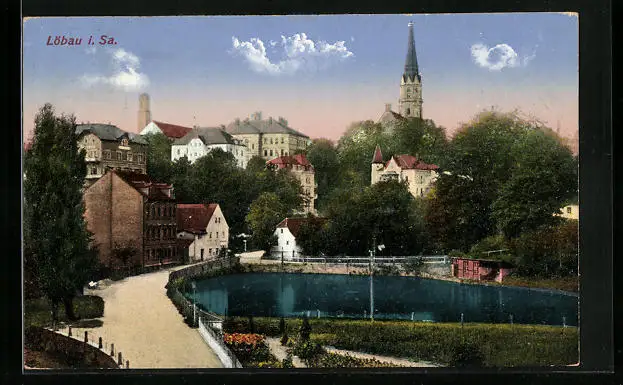 AK Löbau i. Sa., Ortspartie mit Kirche