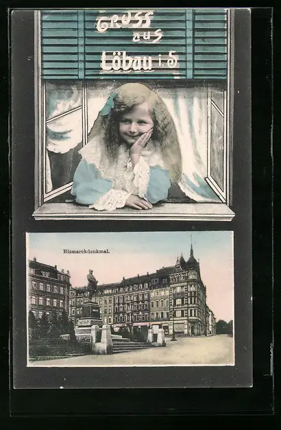 AK Löbau i. Sa., Strassenpartie am Bismarckdenkmal