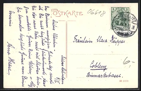 Personenbezogene Daten auf der Rückseite der Karte wurden durch blauen Textmarker unkenntlich gemacht. Die blauen Stellen sind auf die Vorderseite durchgeweicht und wirken sich negativ auf das Postkartenfoto aus