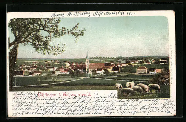 AK Löffingen i. Schwarzwald, Ortsansicht mit Kirche, Schafe grasen auf der Wiese