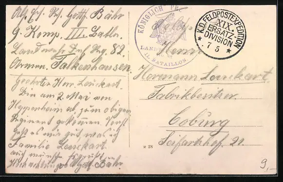Personenbezogene Daten auf der Rückseite der Karte wurden durch blauen Textmarker unkenntlich gemacht. Die blauen Stellen sind auf die Vorderseite durchgeweicht und wirken sich negativ auf das Postkartenfoto aus