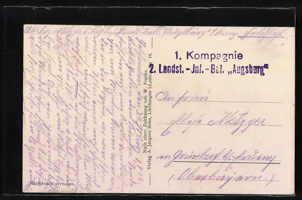 Personenbezogene Daten auf der Rückseite der Karte wurden durch blauen Textmarker unkenntlich gemacht. Die blauen Stellen sind auf die Vorderseite durchgeweicht und wirken sich negativ auf das Postkartenfoto aus