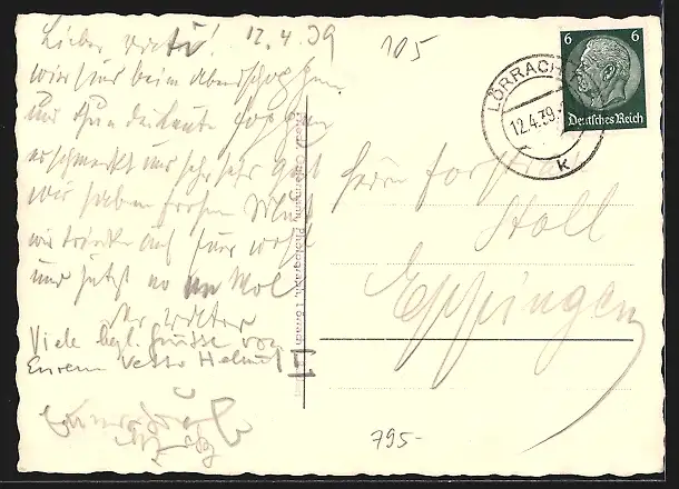 gelaufen 1939, Eckknicke links u. rechts oben, guter Zustand
