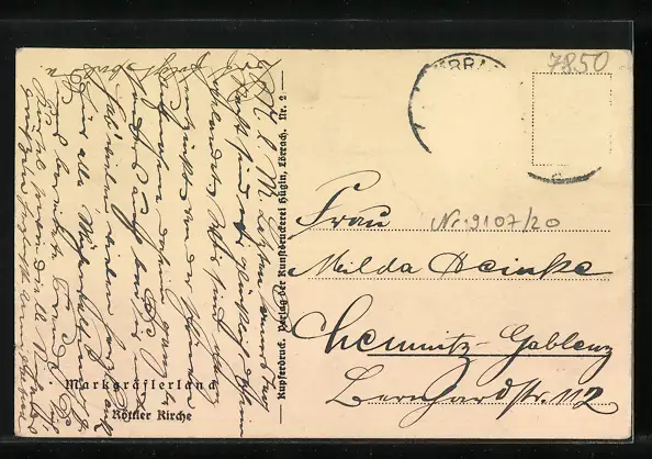 Personenbezogene Daten auf der Rückseite der Karte wurden durch blauen Textmarker unkenntlich gemacht. Die blauen Stellen sind auf die Vorderseite durchgeweicht und wirken sich negativ auf das Postkartenfoto aus