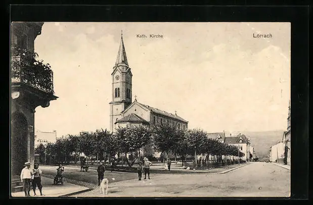 AK Lörrach, Strassenpartie mit Abzweig und Katholischer Kirche