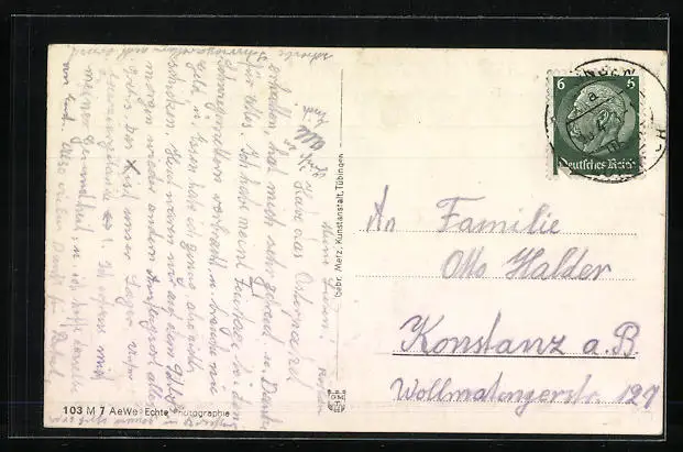 Personenbezogene Daten auf der Rückseite der Karte wurden durch blauen Textmarker unkenntlich gemacht. Die blauen Stellen sind auf die Vorderseite durchgeweicht und wirken sich negativ auf das Postkartenfoto aus
