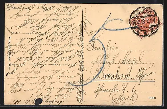 Personenbezogene Daten auf der Rückseite der Karte wurden durch blauen Textmarker unkenntlich gemacht. Die blauen Stellen sind auf die Vorderseite durchgeweicht und wirken sich negativ auf das Postkartenfoto aus