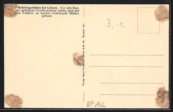 Personenbezogene Daten auf der Rückseite der Karte wurden durch blauen Textmarker unkenntlich gemacht. Die blauen Stellen sind auf die Vorderseite durchgeweicht und wirken sich negativ auf das Postkartenfoto aus