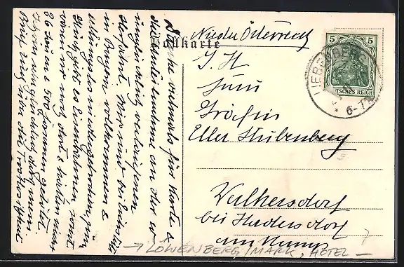 Personenbezogene Daten auf der Rückseite der Karte wurden durch blauen Textmarker unkenntlich gemacht. Die blauen Stellen sind auf die Vorderseite durchgeweicht und wirken sich negativ auf das Postkartenfoto aus