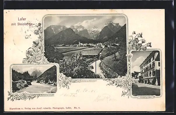 AK Lofer, Gasthof zum Bräu, Teilansicht mit Steinbergen, Teufelssteg