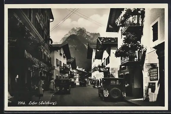 AK Lofer, Strassenleben mit Autos und Geschäften