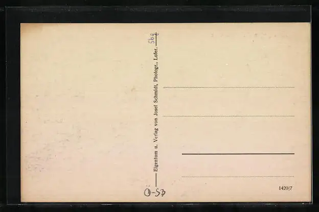 Personenbezogene Daten auf der Rückseite der Karte wurden durch blauen Textmarker unkenntlich gemacht. Die blauen Stellen sind auf die Vorderseite durchgeweicht und wirken sich negativ auf das Postkartenfoto aus