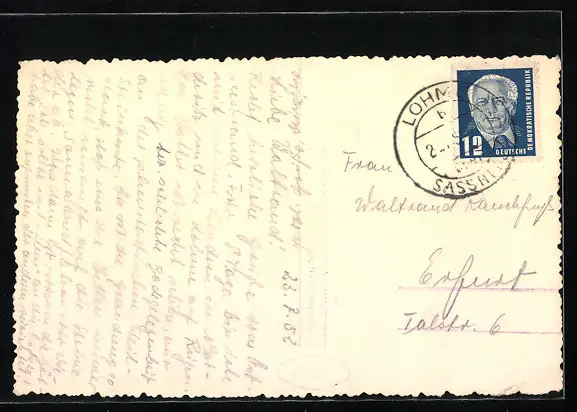 Personenbezogene Daten auf der Rückseite der Karte wurden durch blauen Textmarker unkenntlich gemacht. Die blauen Stellen sind auf die Vorderseite durchgeweicht und wirken sich negativ auf das Postkartenfoto aus