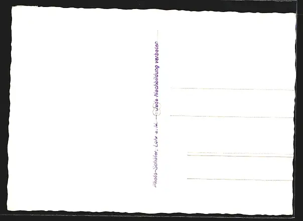 Personenbezogene Daten auf der Rückseite der Karte wurden durch blauen Textmarker unkenntlich gemacht. Die blauen Stellen sind auf die Vorderseite durchgeweicht und wirken sich negativ auf das Postkartenfoto aus