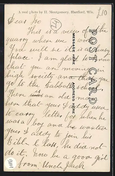 Personenbezogene Daten auf der Rückseite der Karte wurden durch blauen Textmarker unkenntlich gemacht. Die blauen Stellen sind auf die Vorderseite durchgeweicht und wirken sich negativ auf das Postkartenfoto aus