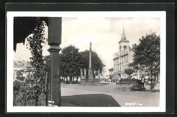 AK Lomnice n. Pop., Ortspartie mit Denkmal