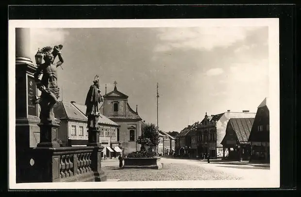 AK Lomnice n. Pop., Strassenpartie im Ortskern mit Kirche