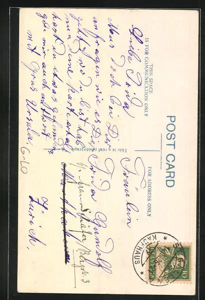 Personenbezogene Daten auf der Rückseite der Karte wurden durch blauen Textmarker unkenntlich gemacht. Die blauen Stellen sind auf die Vorderseite durchgeweicht und wirken sich negativ auf das Postkartenfoto aus