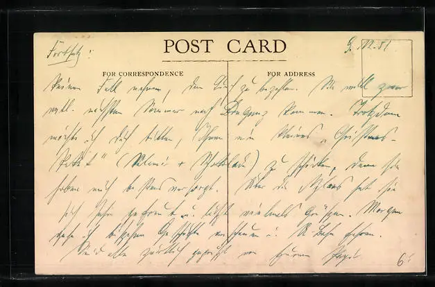 Personenbezogene Daten auf der Rückseite der Karte wurden durch blauen Textmarker unkenntlich gemacht. Die blauen Stellen sind auf die Vorderseite durchgeweicht und wirken sich negativ auf das Postkartenfoto aus