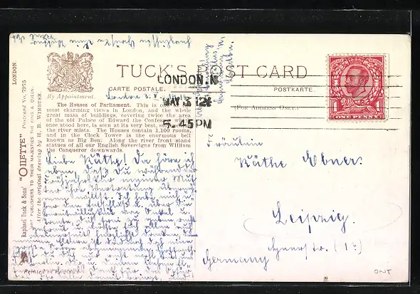 alte Ansichtskarte, gelaufen 1912, minimaler Einriss li. unten, guter Zustand