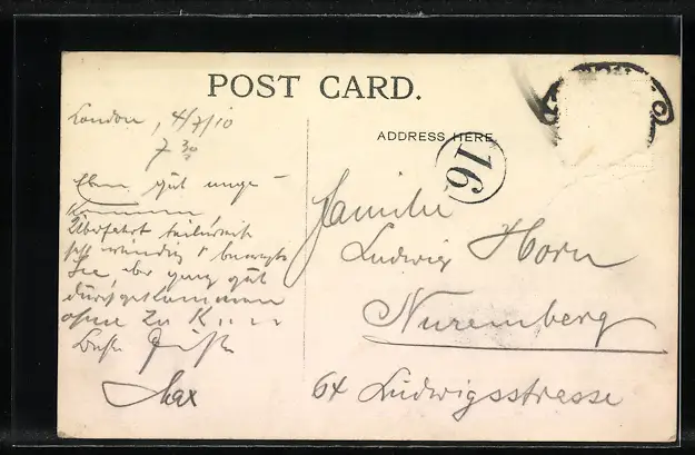 gelaufen 1910, Briefmarke entfernt, rückseitig Oberflächenschaden, Eckknick re. unten, Bugspuren li. oben, guter Zustand
