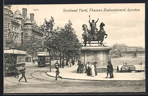 AK London, Scotland Yard, Thames Embankment, Strassenbahn