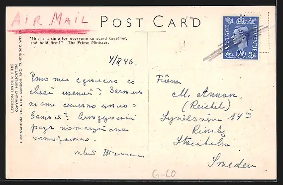 Personenbezogene Daten auf der Rückseite der Karte wurden durch blauen Textmarker unkenntlich gemacht. Die blauen Stellen sind auf die Vorderseite durchgeweicht und wirken sich negativ auf das Postkartenfoto aus