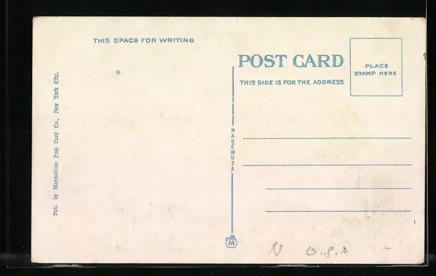 Personenbezogene Daten auf der Rückseite der Karte wurden durch blauen Textmarker unkenntlich gemacht. Die blauen Stellen sind auf die Vorderseite durchgeweicht und wirken sich negativ auf das Postkartenfoto aus